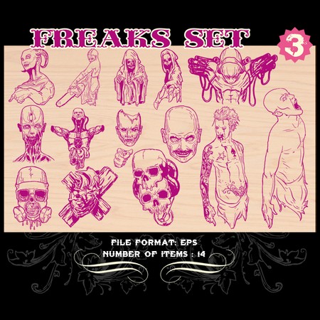 Freaks are here to feed your darkest design dreams and horror ideas. Our vector offer you a wide range of possibilities – monsters, creatures, zombies or deformed animals - all very useful when it comes to designing for rock bands, motorcycles clubs, CD covers and posters. It's a combination of many different styles and textures to bring you some awesome EPS vector files that will rock forever.