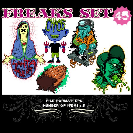 Freaks are here to feed your darkest design dreams and horror ideas. Our vector offer you a wide range of possibilities – monsters, creatures, zombies or deformed animals - all very useful when it comes to designing for rock bands, motorcycles clubs, CD covers and posters. It's a combination of many different styles and textures to bring you some awesome EPS vector files that will rock forever.