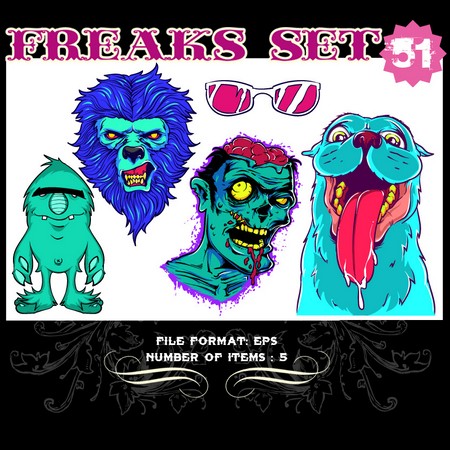 Freaks are here to feed your darkest design dreams and horror ideas. Our vector offer you a wide range of possibilities – monsters, creatures, zombies or deformed animals - all very useful when it comes to designing for rock bands, motorcycles clubs, CD covers and posters. It's a combination of many different styles and textures to bring you some awesome EPS vector files that will rock forever.