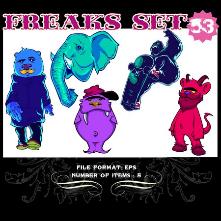 Freaks are here to feed your darkest design dreams and horror ideas. Our vector offer you a wide range of possibilities – monsters, creatures, zombies or deformed animals - all very useful when it comes to designing for rock bands, motorcycles clubs, CD covers and posters. It's a combination of many different styles and textures to bring you some awesome EPS vector files that will rock forever.