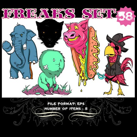 Freaks are here to feed your darkest design dreams and horror ideas. Our vector offer you a wide range of possibilities – monsters, creatures, zombies or deformed animals - all very useful when it comes to designing for rock bands, motorcycles clubs, CD covers and posters. It's a combination of many different styles and textures to bring you some awesome EPS vector files that will rock forever.