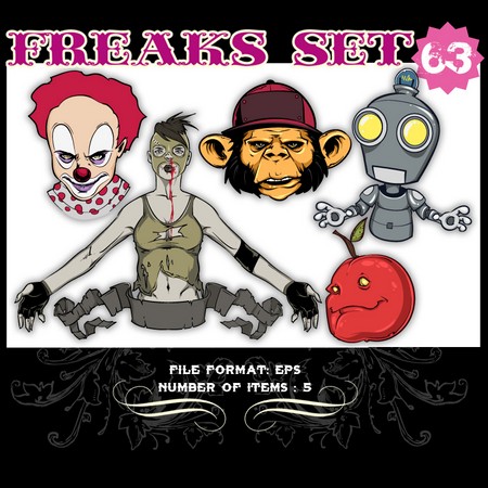 Freaks are here to feed your darkest design dreams and horror ideas. Our vector offer you a wide range of possibilities – monsters, creatures, zombies or deformed animals - all very useful when it comes to designing for rock bands, motorcycles clubs, CD covers and posters. It's a combination of many different styles and textures to bring you some awesome EPS vector files that will rock forever.
