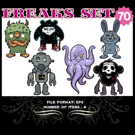 Freaks are here to feed your darkest design dreams and horror ideas. Our vector offer you a wide range of possibilities – monsters, creatures, zombies or deformed animals - all very useful when it comes to designing for rock bands, motorcycles clubs, CD covers and posters. It's a combination of many different styles and textures to bring you some awesome EPS vector files that will rock forever.