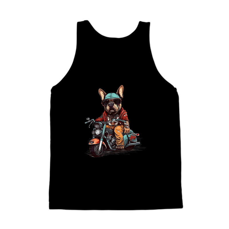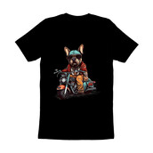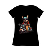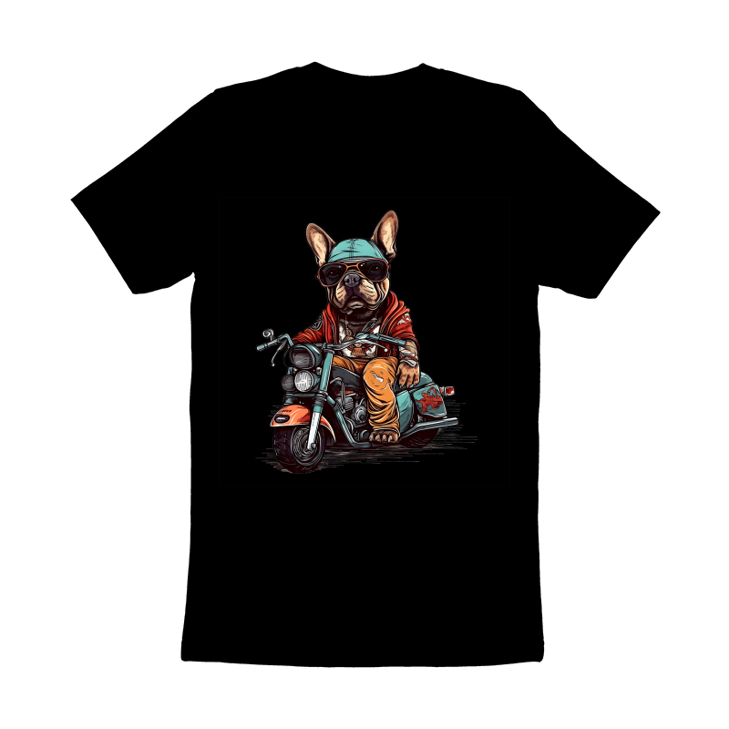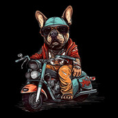 French bulldog is riding a chopper style motorcycle
