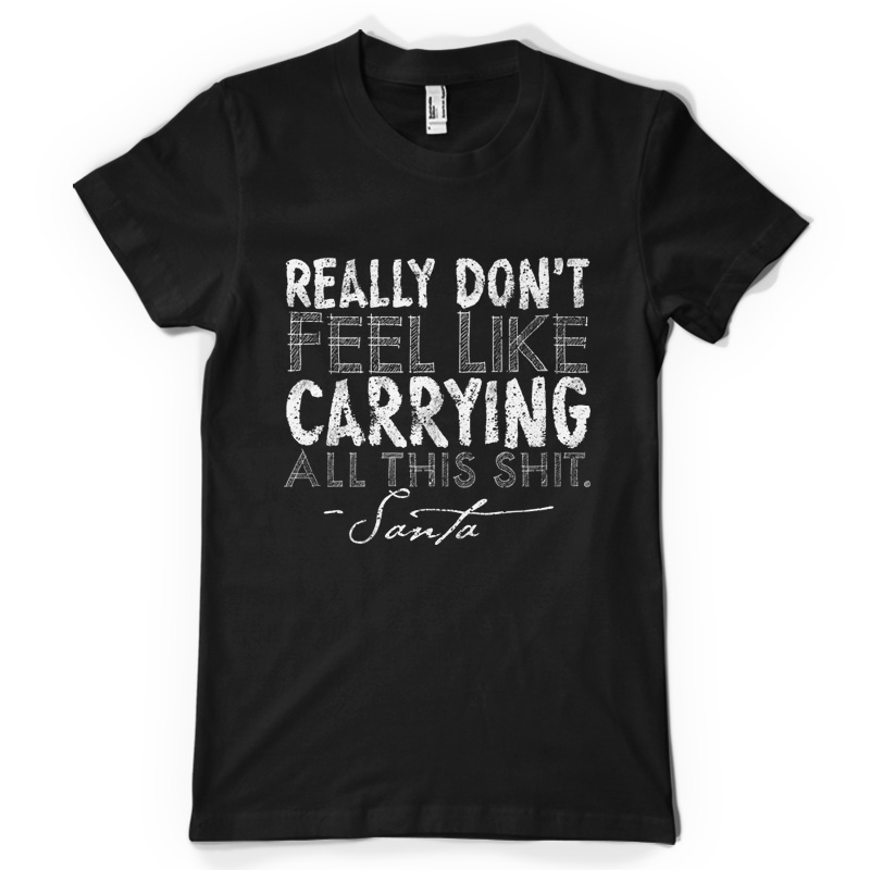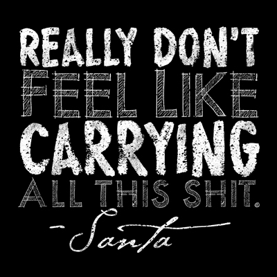 A unique typography of a humor christmas quote "Really don't feel like carrying all this shit. - Santa". This designs has a grunge effect which makes it one of a kind and unique. Can be printed in any colors on any shirts. Can also be printed as stickers. File contains a PSD file with 17x24 in 300 dpi.