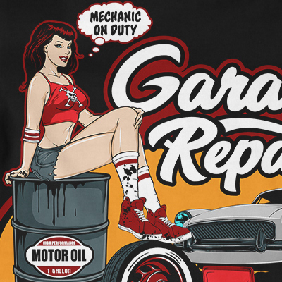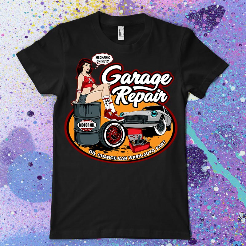 Garage Repair t-shirt design features a pin up mechanic design detailed screen print now available for Adobe Illustrator, Adobe Photoshop and Corel Draw and can be used for digital printing and screenprinting