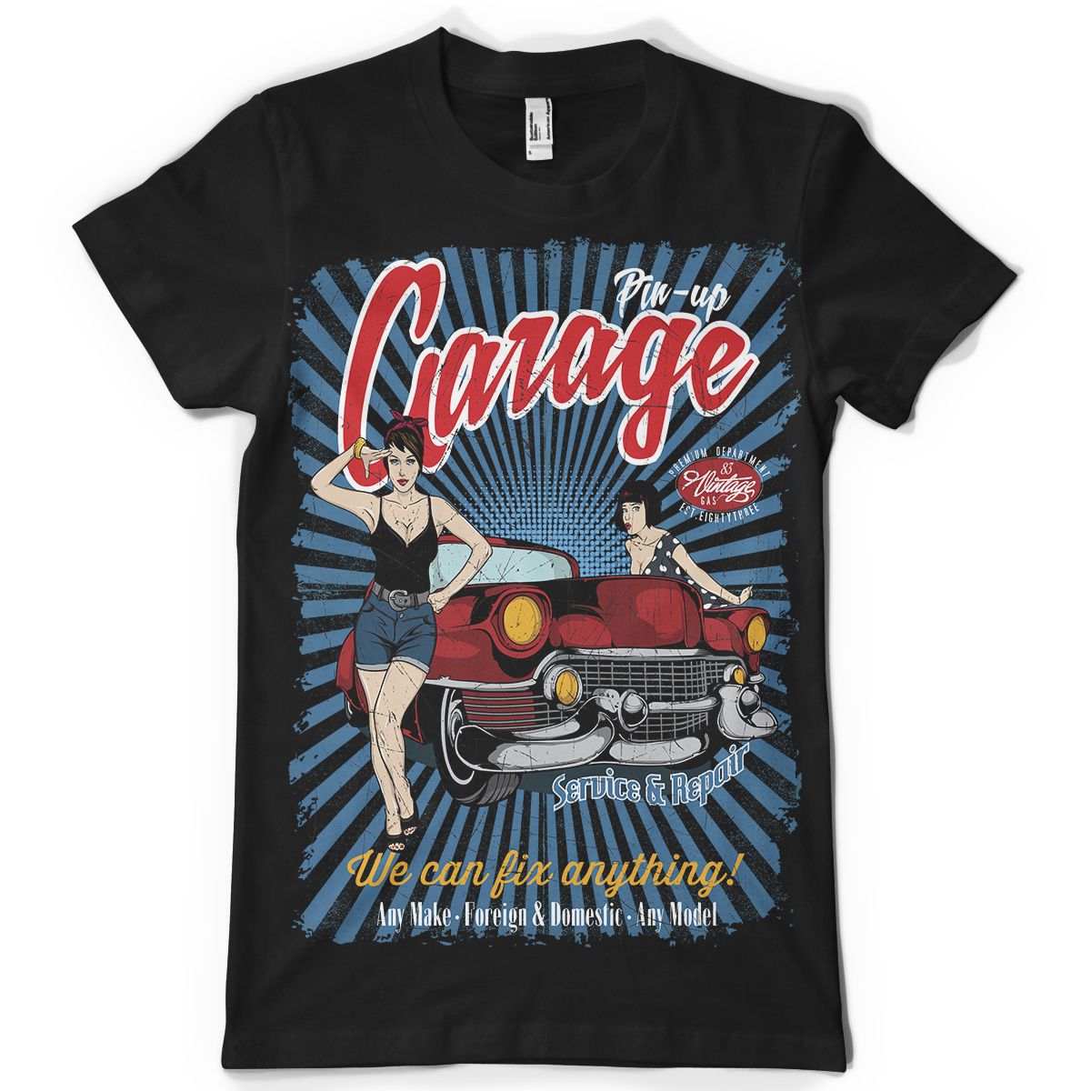 Garage t-shirt design features a detailed screen print of sexy pinup girls now available for Adobe Illustrator, Adobe Photoshop and Corel Draw and can be used for digital printing and screenprinting .
