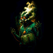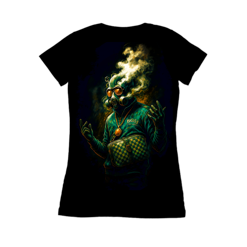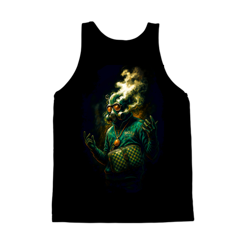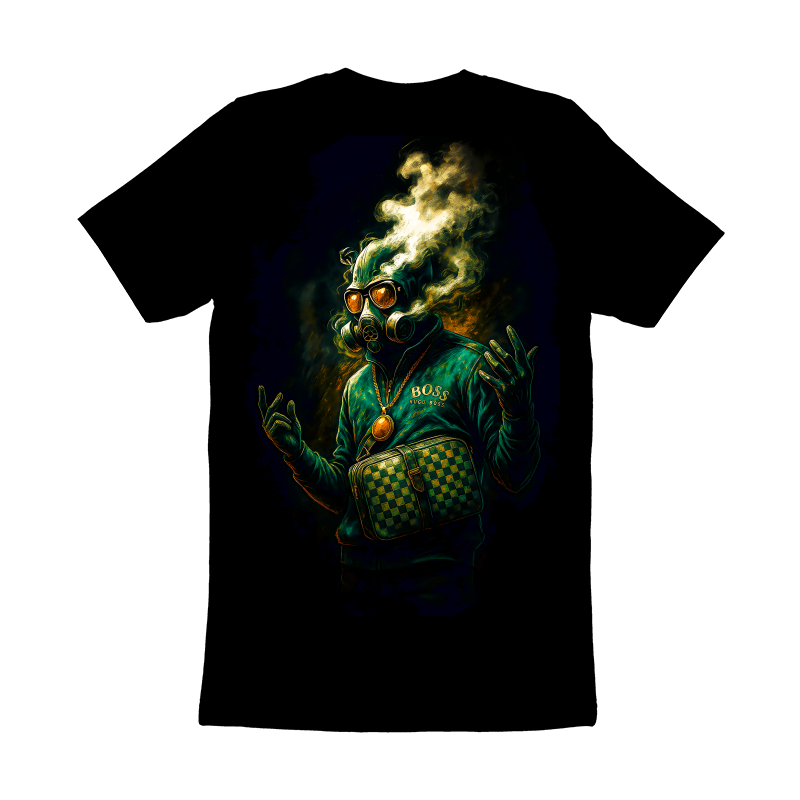 This striking image features a figure clad in a gas mask, exuding an aura of urban sophistication and streetwise confidence. The gas mask, partially obscured by stylized smoke, adds an element of mystery and intrigue, while the designer tracksuit and checkered crossbody bag hint at a high-fashion sensibility. A chunky gold chain and medallion complete the ensemble, reinforcing the 'boss' aesthetic. The color palette is rich and vibrant, with deep greens and golds contrasting against the dark background, creating a visually arresting composition. The overall effect is both edgy and refined, suggesting a character who navigates the gritty realities of urban life with style and swagger. Designers could use this image for streetwear apparel, album covers, or urban-themed marketing materials. The combination of high fashion and dystopian elements makes it suitable for brands targeting a young, trend-conscious audience. It could also be incorporated into digital art projects or used as a profile picture to convey a bold, unconventional persona.