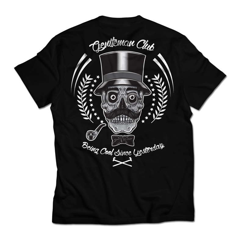 Gentleman Club T shirt Illustration. An illustration of gentleman skull and some ornaments. Easy to replace the text and colors. ZIP Feautures 2 Folder for dark and light backgrounds. Each folder contain 1 EPS 10 1 Ai 1 PSD Size 16'x24' CMYK Color mode Layered Editable text