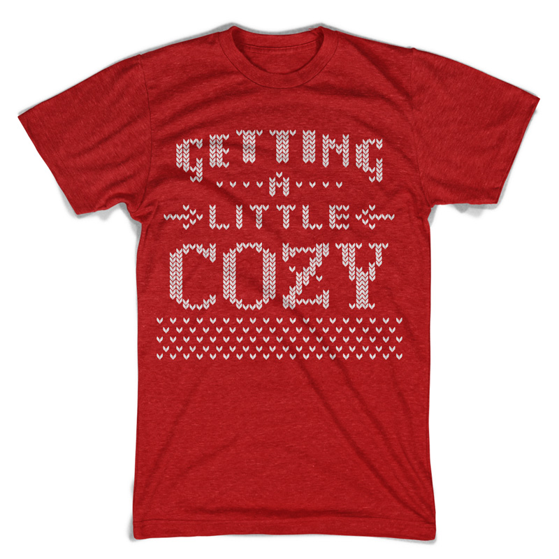 Getting a little cozy t-shirt design featuring traditional winter holiday patterns, that imitates the texture of knitted pullovers. The template can be used for digital printing and screenprinting.