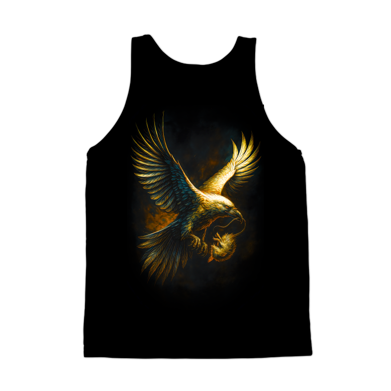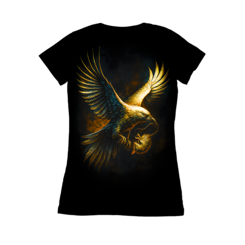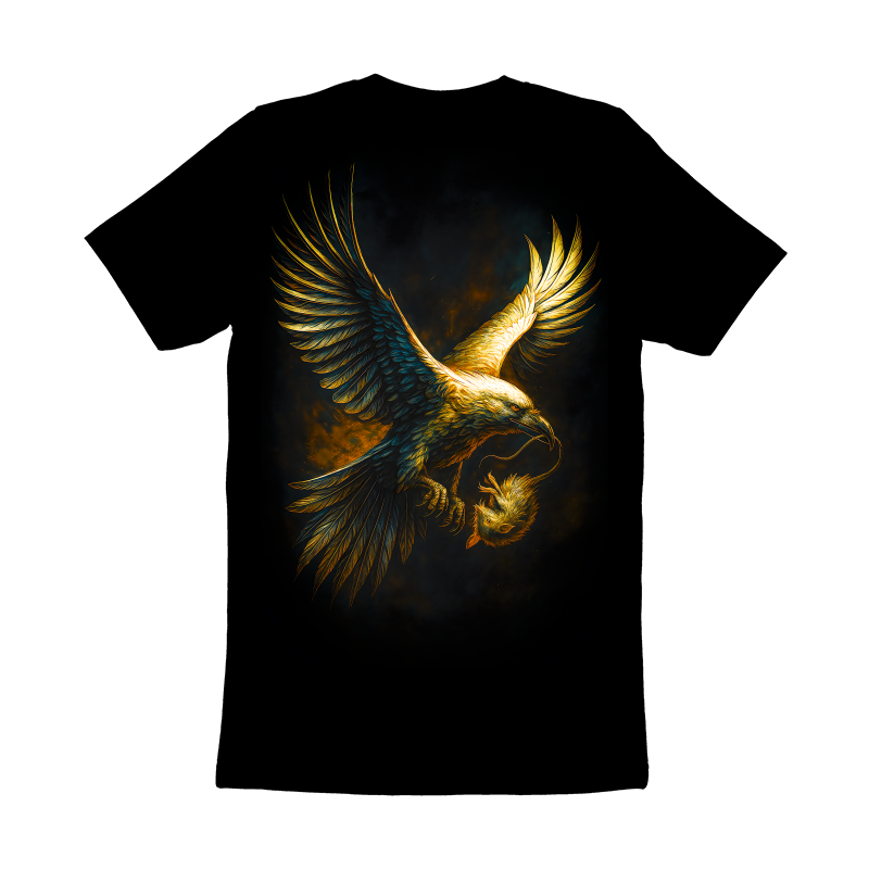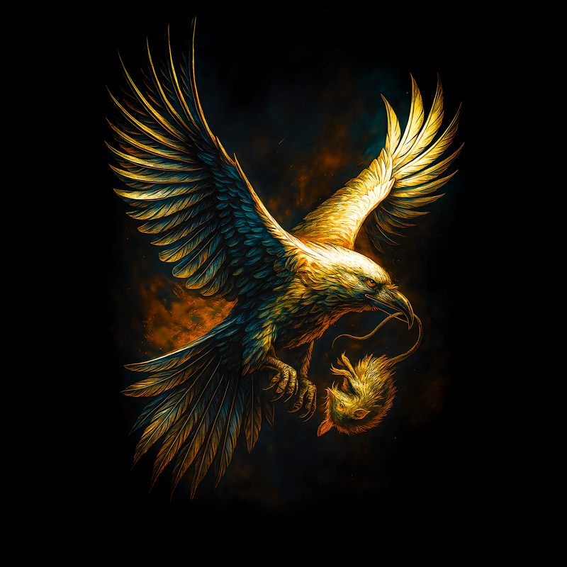 This artwork captures a majestic eagle in flight, its plumage rendered in striking golds and blues against a dark, moody backdrop. The eagle clutches a small creature in its talons, creating a dramatic focal point. The rendering style combines realistic detail with painterly textures, giving it a dynamic and powerful feel. The color palette is rich and warm, with the gold tones of the eagle contrasting beautifully against the cooler blues and blacks. This image evokes themes of power, nature, and the predator-prey relationship, making it visually compelling and thought-provoking. The detail in the feathers and the intensity in the eagle's gaze are particularly striking.