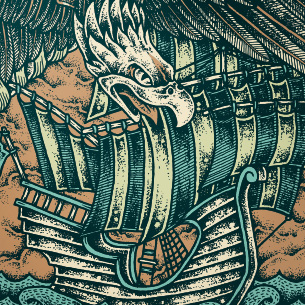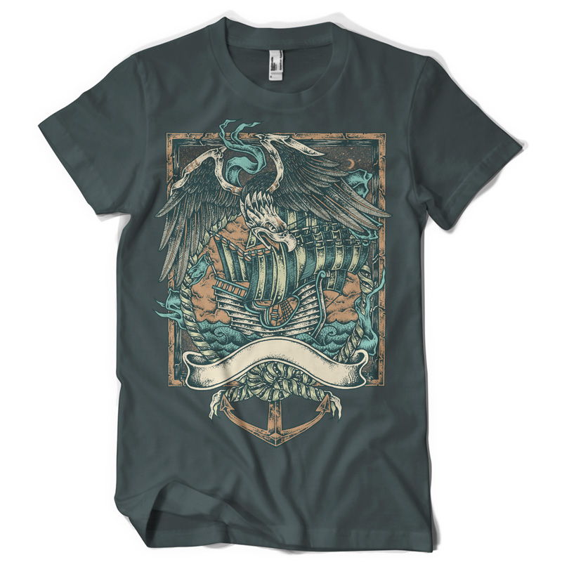 Glorious graphic design template in vector format, featuring detailed eagle attacking ship now available for Adobe Illustrator, Adobe Photoshop and Corel Draw and can be used for digital printing and screenprinting .
