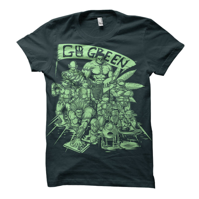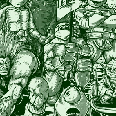 The green guys (Hulk, Piccolo, The teenage mutants ninja turtles, Blanka, Mike and Yoda here) meet up for the annual “GO GREEN” convention. They fight together to..save the planet? And yeah, taking pizza from a hungry Blanka is never a good idea.