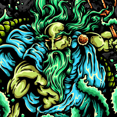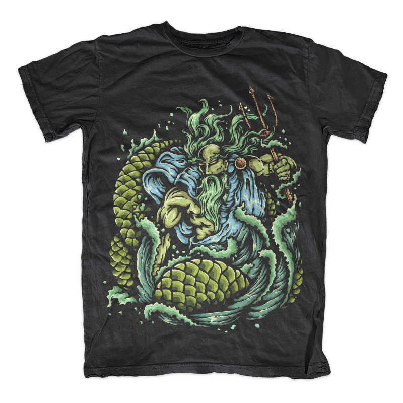 Illustration of neptune / poseidon god of sea holding trident with ocean and water background. Ready to print on t-shirt.
