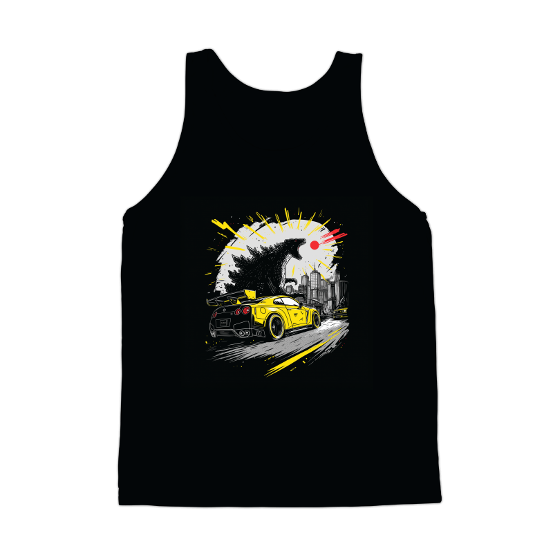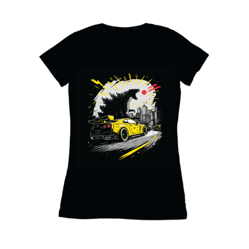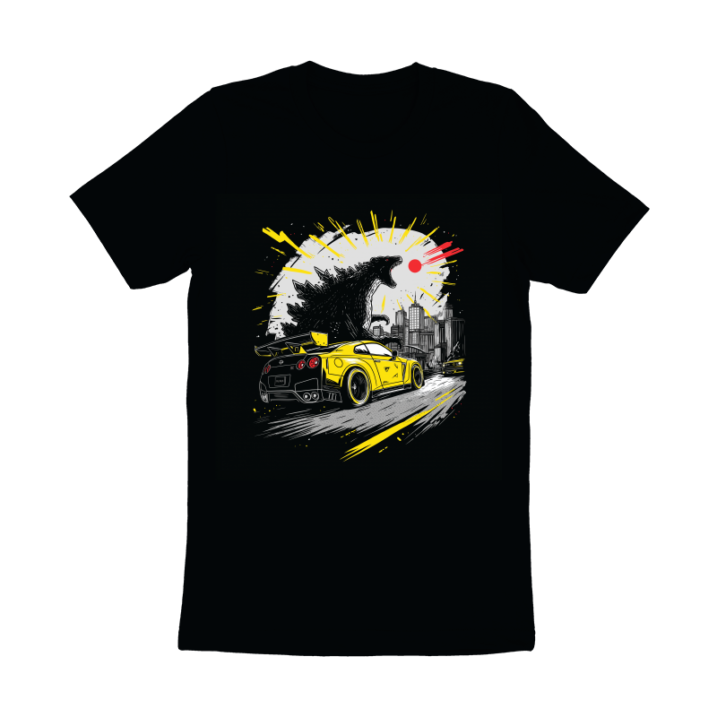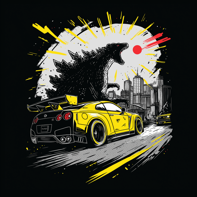 This dynamic design features a striking contrast between a classic monster movie theme and modern automotive aesthetics. Godzilla, rendered in a textured black and white style, looms over a cityscape, exuding power and destruction. In the foreground, a vibrant yellow GT-R sports car speeds away, adding a sense of urgency and excitement. The color palette is limited to black, white, yellow, and a touch of red for Godzilla's atomic breath, creating a visually impactful image. The design blends elements of urban decay with high-speed action, appealing to fans of both monster movies and car culture. The overall composition is carefully balanced, drawing the eye from the monster to the car and back again, creating a sense of movement and chaos.