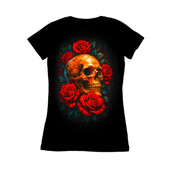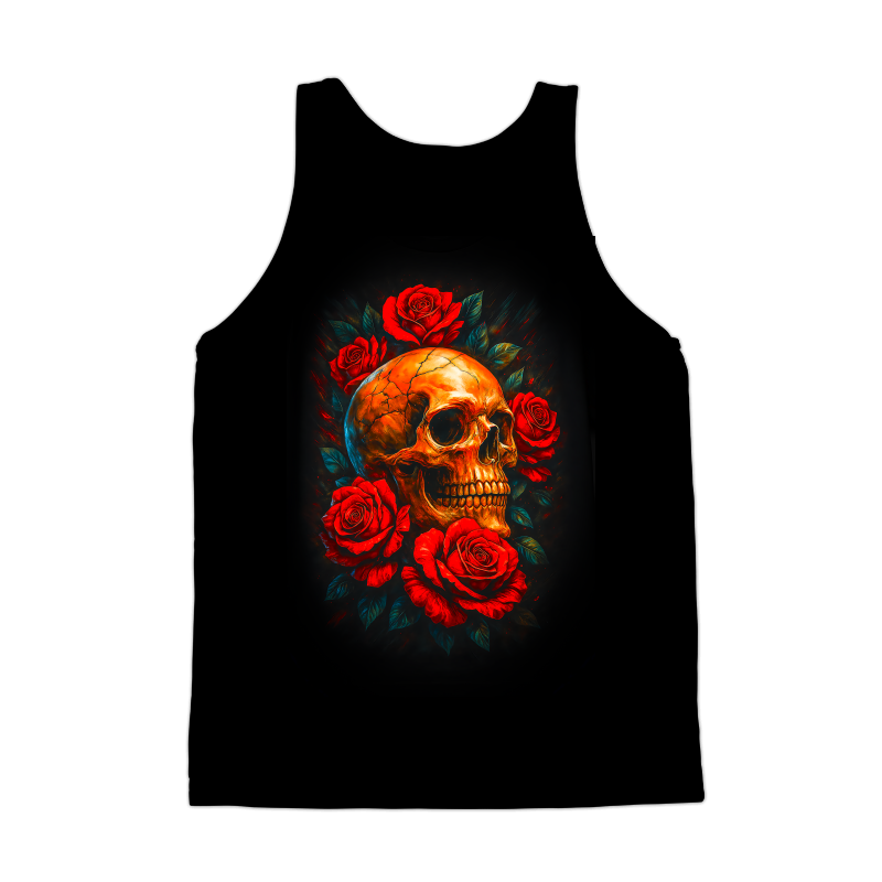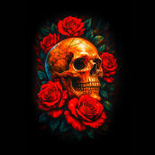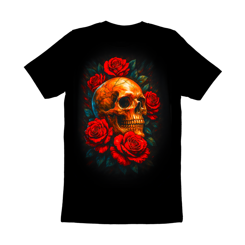 This striking design features a golden skull, its surface intricately detailed with cracks and fissures, lending it an aged, almost antique appearance. The skull is framed by a vibrant array of red roses, their petals lush and full, creating a stark contrast between life and death, beauty and decay. The dark background accentuates the vivid colors of the skull and roses, adding depth and drama to the composition. The artistic style blends elements of classic gothic art with a modern, almost digital painting aesthetic. The overall effect is both captivating and slightly unsettling, drawing the viewer in with its morbid beauty. Designers could use this image for various purposes, including t-shirt designs, posters, and album art. It would be perfect for bands in the rock, metal, or gothic genres. The design could also be adapted for use in tattoo art or as a striking graphic for book covers or video game promotional material. The combination of beauty and morbidity makes it versatile.
