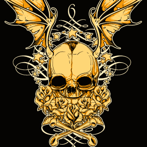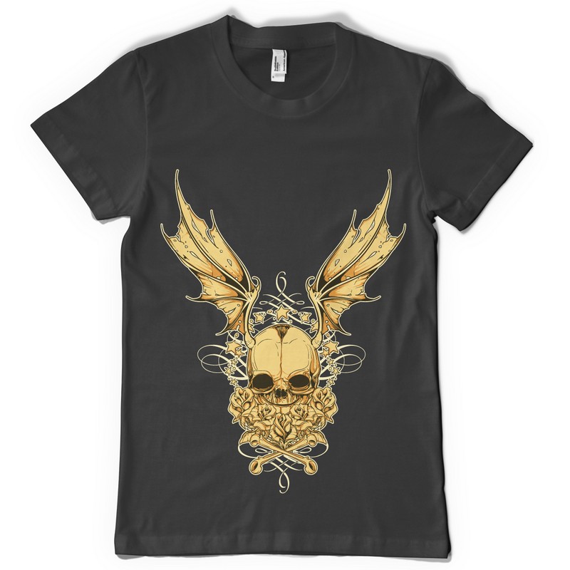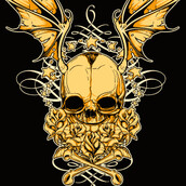 Golden wings graphic design template in vector format, featuring detailed golden skull and roses now available for Adobe Illustrator, Adobe Photoshop and Corel Draw and can be used for digital printing and screenprinting .