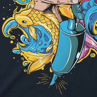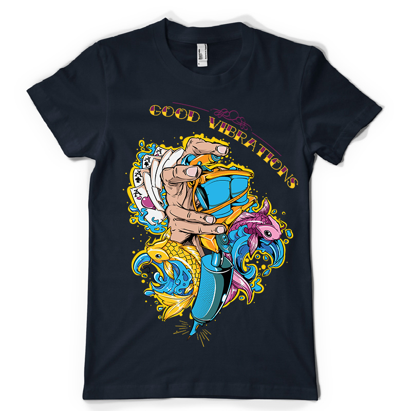 Good Vibrations t-shirt design features a detailed screen print of hand holding graffiti spray now available for Adobe Illustrator, Adobe Photoshop and Corel Draw and can be used for digital printing and screenprinting .