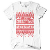 Greetings t-shirt design featuring the traditional greeting "Merry Christmas" in a sweater like pattern, that imitates the texture of knitted pullovers. The template can be used for digital printing and screenprinting.