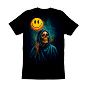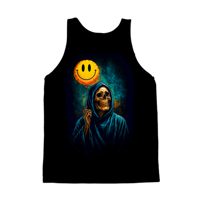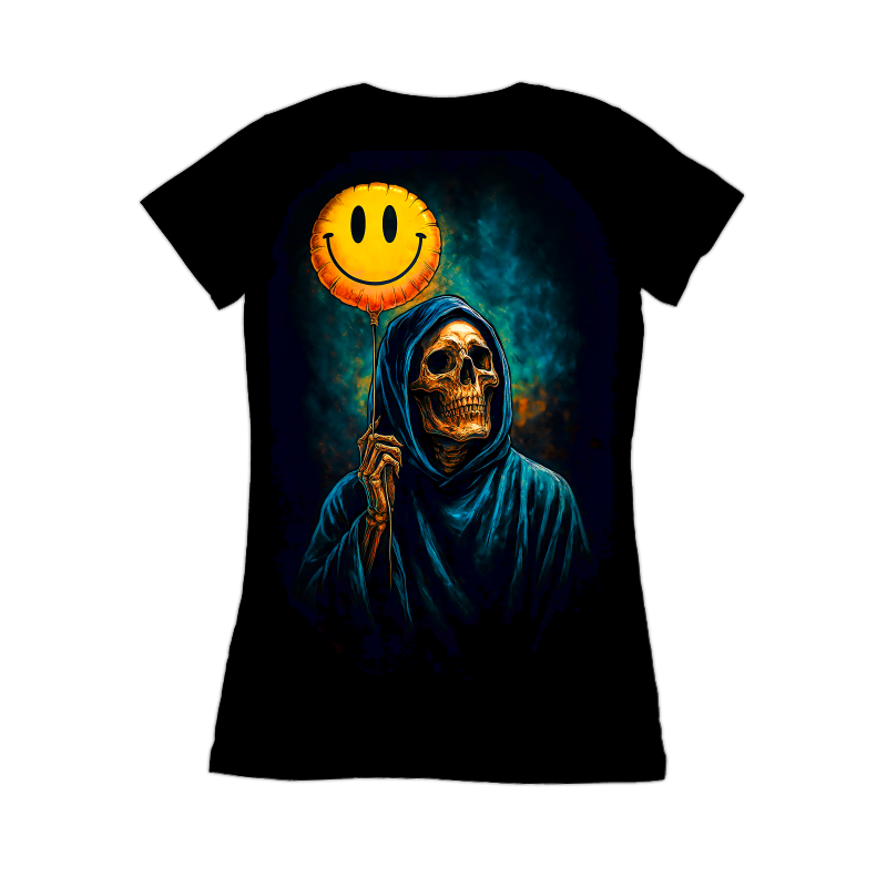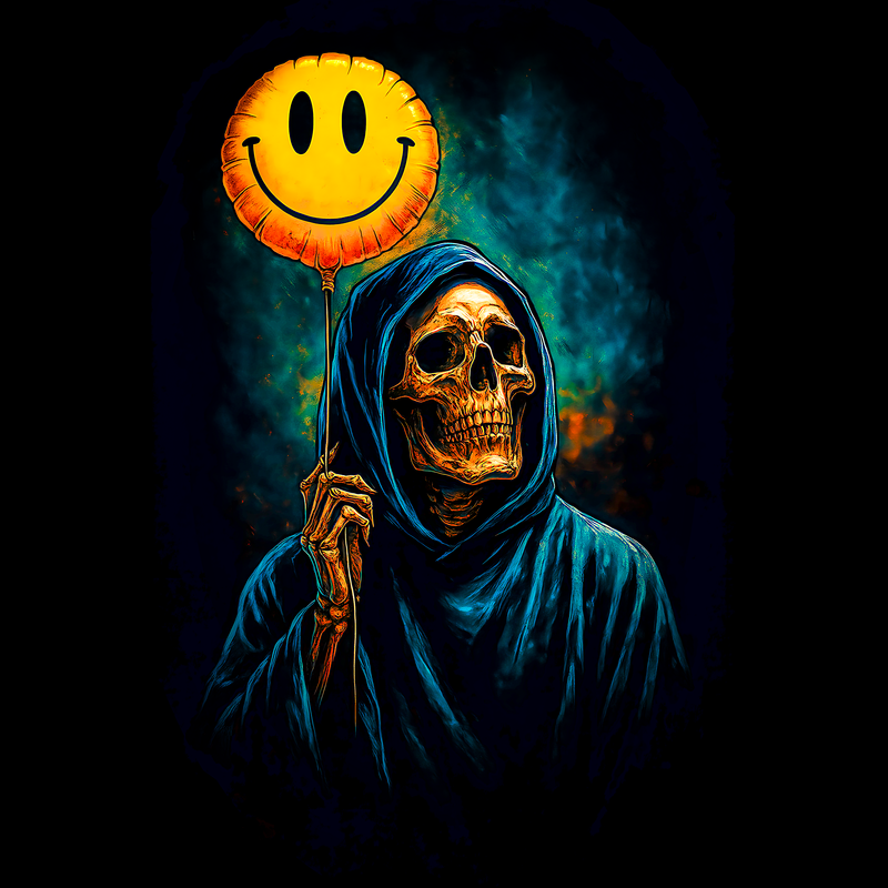 This artwork presents a stark contrast between life and death, joy and despair. A skeletal figure, cloaked in a deep blue hooded robe, holds a bright yellow balloon emblazoned with a cheerful smiley face. The skull's detailed rendering, with its hollow eye sockets and bony structure, contrasts sharply with the balloon's lightheartedness. The background features a swirling vortex of teal and dark blue, adding to the overall sense of unease and mystery. The juxtaposition of the macabre and the whimsical creates a thought-provoking image. The color palette is dominated by cool blues and yellows, enhancing the contrast and emotional impact. Designers could use this image to create striking visuals for various projects. It would be suitable for posters, t-shirts, and album covers, especially within the horror, alternative, or gothic genres. The contrasting elements make it eye-catching and memorable, perfect for designs that aim to make a bold statement.