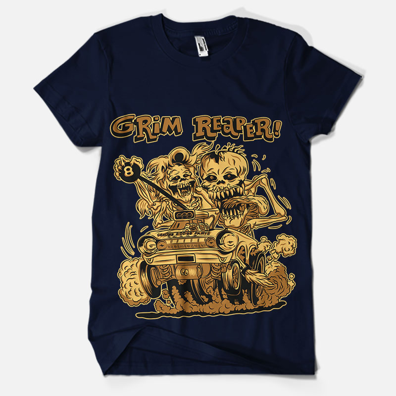 "GRIM REAPER" HighT-shirt design use 3 color on navy blue with AI CS4 and EPS CS4 file and separate color layer by layer. For recomended apply to front print and can be used for digital printing and screenprinting.