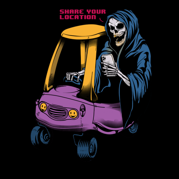 grim reaper the soul collector holding a smartphone and asking you to share your location he will pick you up in his cozy coupe. A theme suitable for Halloween, horror and boku and movie lovers. skull bones, horror hallowen, goblin, newest t-shirts, spooky, scary movie, creepy, scream, rlstine, horror books, 80s kids, stine, 90s kids, dummies