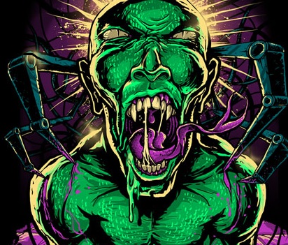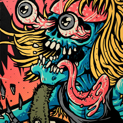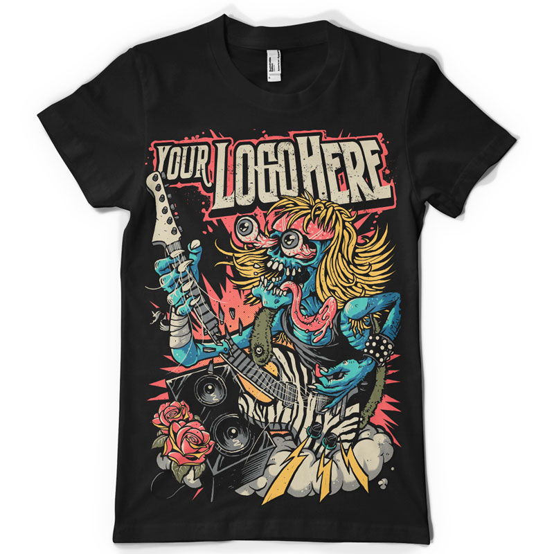 Guitar Shredder t-shirt designs featuring an eye-bulging, gruesome character with guitar and detailed sorrounding including speakers,roses and thunder.The file is available in PSD format.