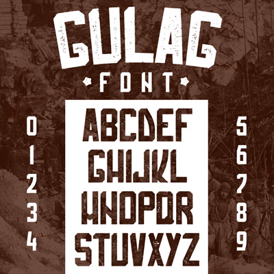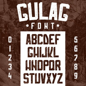 "Gulag" is a fresh, original font created exclusively for Tshirt-Factory.com. The font includes 26 small and capital letters; numbers from 0 to 9; the font is available in TTF format, with a discreet vintage effect.