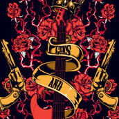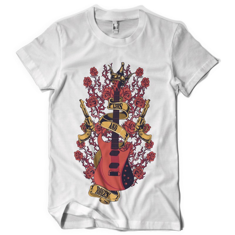 Guns and roses digital template in vector format, featuring detailed guitar arounded by roses now available for Adobe Illustrator, Adobe Photoshop and Corel Draw and can be used for digital printing and screenprinting .