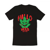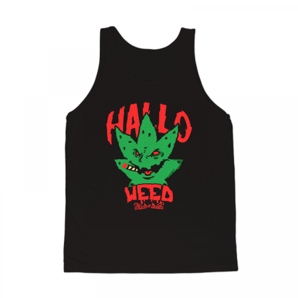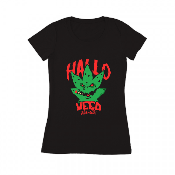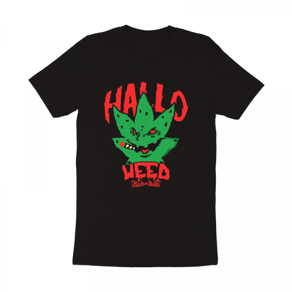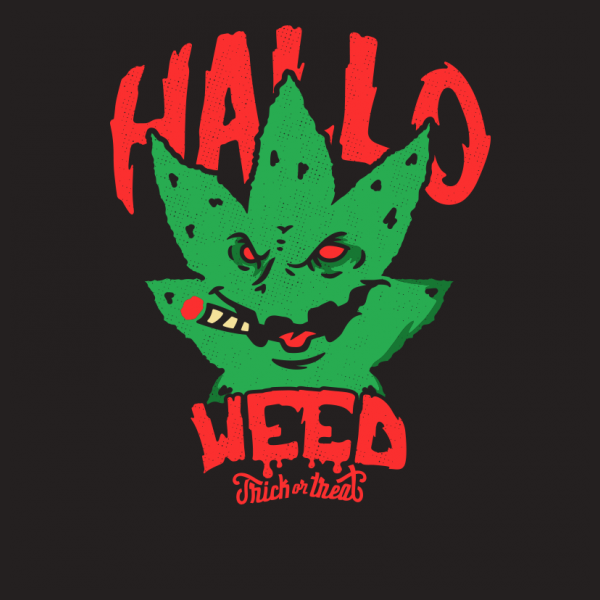 "Halloweed" T-shirt design featuring a cartoon evil weed leaf. The files available are suitable for Adobe Illustrator and Adobe Photoshop and can be used for digital printing and screen-printing.
