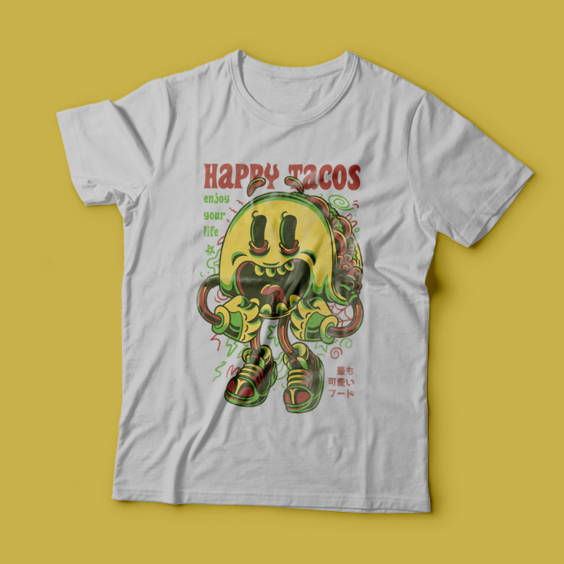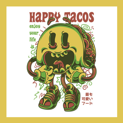 Happy Tacos it's a character design that was made in Adobe Illustrator. Based on vector file, easy to resize and edit. File features AI, EPS, and PNG all in zip, CMYK color mode and 4 color. Can be used for digital printing and screen printing.