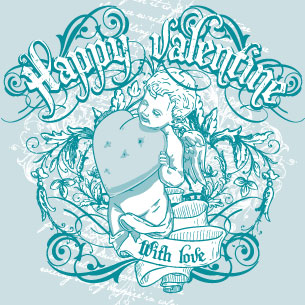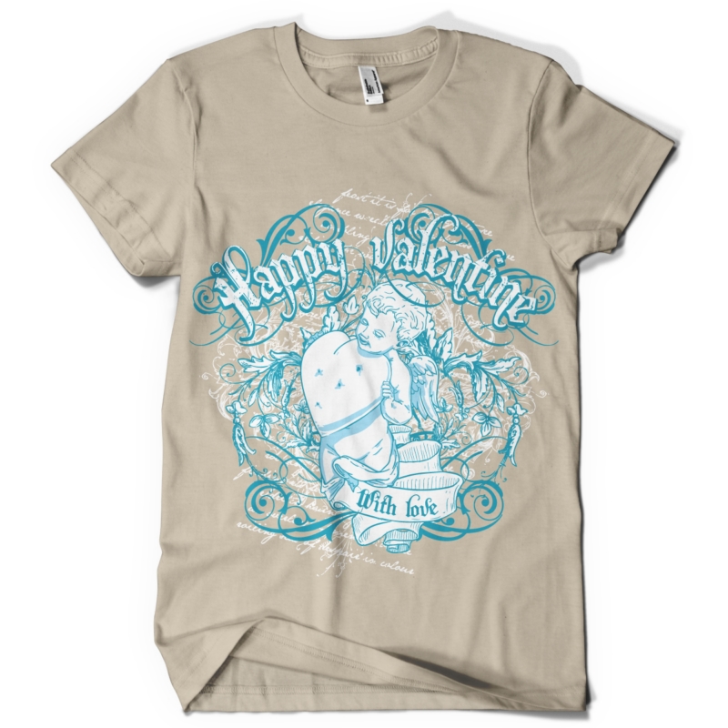 Happy Valentine t-shirt design featuring detailed angel Valentine with flourish details is available in vector format for Adobe Illustrator, Adobe Photoshop and Corel Draw and can be used for digital printing and screenprinting .