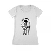 Is a monoline illustration that is suitable for apparel or merchandise about skull, skeleton, horror, halloween, trick or treat, death, ghost, grim reaper, backpacker, hiking, camping, mountain, adventure, travel, vacation.