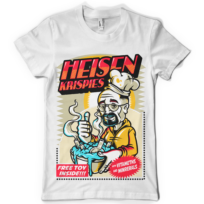 Heisen Krispies t-shirt design featuring cartooned Heisenberg cooking .T-shirt Design is available only afor Adobe Illustrator, Adobe Photoshop and Corel Draw and can be used for digital printing and screenprinting.