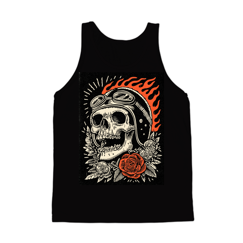 Designers can use this image for a variety of projects, including t-shirt designs, posters, and logos. Its vintage biker aesthetic makes it perfect for brands targeting motorcycle enthusiasts or those seeking a rebellious and edgy image. The combination of skull, flames, and roses offers a unique and visually appealing design element that can be easily incorporated into various layouts and compositions.