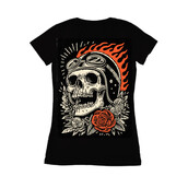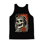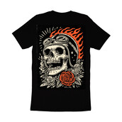 This striking design features a skull wearing a vintage biker helmet and goggles, adorned with stylized flames and roses. The artwork employs a bold, contrasting color palette of black, white, and orange, creating a visually arresting image. The skull is intricately detailed, with careful attention paid to the bone structure and texture. The helmet adds a touch of retro cool, while the flames suggest speed and danger. The roses provide a contrasting element of beauty and fragility, creating a compelling juxtaposition. The overall style is reminiscent of classic tattoo art and vintage motorcycle graphics, making it ideal for designs that require a rebellious and edgy aesthetic. The design has a slightly distressed texture, adding to its vintage appeal.