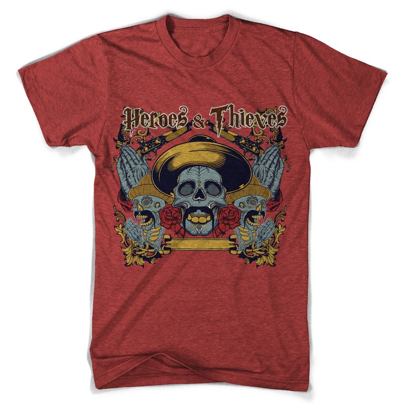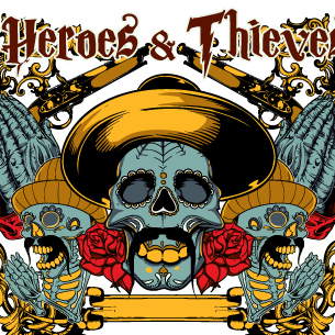Heroes and thieves digital design template in vector format, featuring detailed mexican skulls now available for Adobe Illustrator, Adobe Photoshop and Corel Draw and can be used for digital printing and screenprinting .