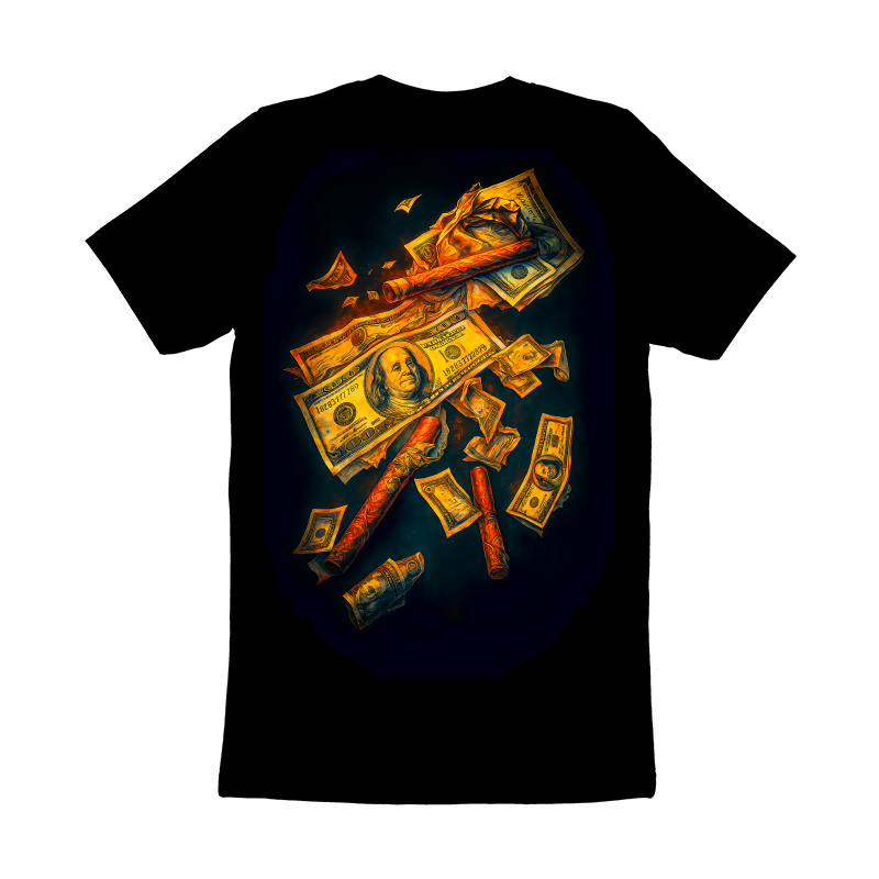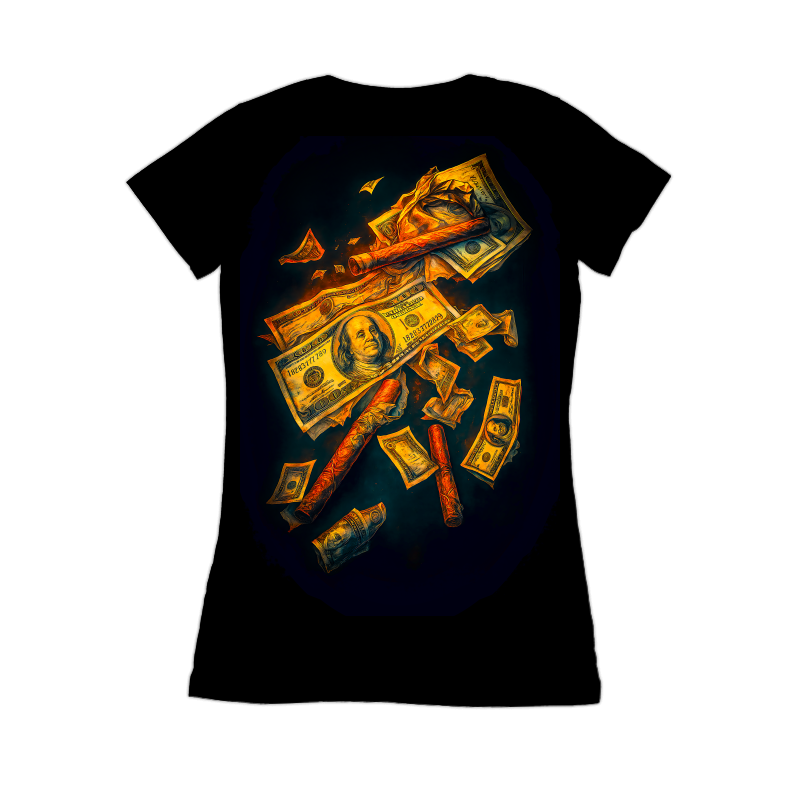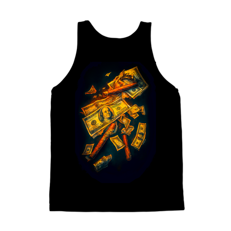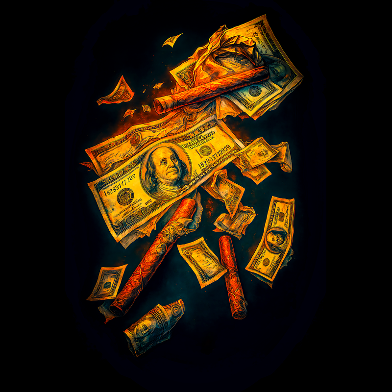 This artwork plunges into the opulent world of wealth and indulgence, showcasing a cascade of hundred-dollar bills intertwined with luxurious cigars. The composition exudes a sense of extravagance, with the golden hues of the money contrasting against the rich, earthy tones of the cigars. The artistic style leans towards a blend of realism and illustration, capturing the textures of the paper currency and the smooth, rolled tobacco. The lighting adds depth and dimension, highlighting the intricate details of each element. It evokes a sense of high-stakes living and the allure of the finer things in life. The image suggests themes of success, ambition, and the pursuit of pleasure, making it a compelling visual statement about modern affluence and lifestyle. Designers could leverage this image to enhance projects related to finance, luxury goods, or high-end events. It would work well in promotional materials for casinos, exclusive clubs, or investment firms. The artwork's bold and visually striking nature makes it suitable for attention-grabbing advertisements or website banners. It could also be integrated into editorial content focusing on wealth management or lifestyle trends.