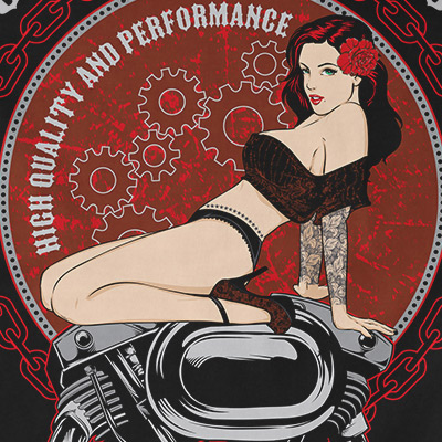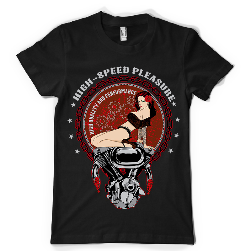 High-Speed Pleasure t-shirt design features a detailed screen print of beautiful retro girl now available for Adobe Illustrator, Adobe Photoshop and Corel Draw and can be used for digital printing and screenprinting .