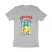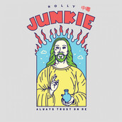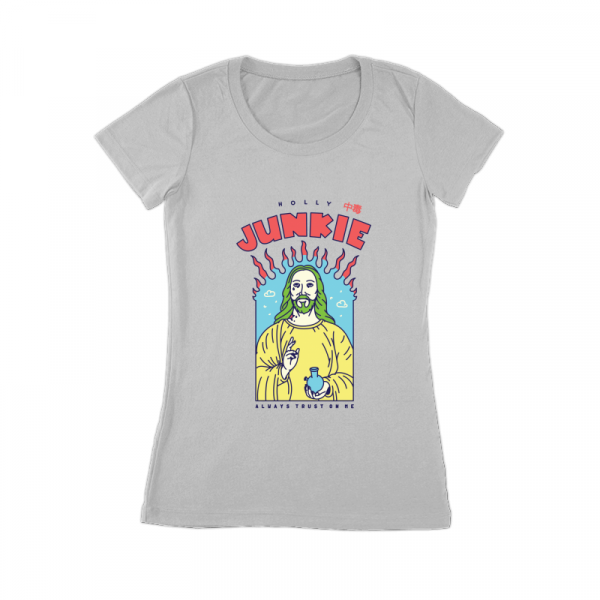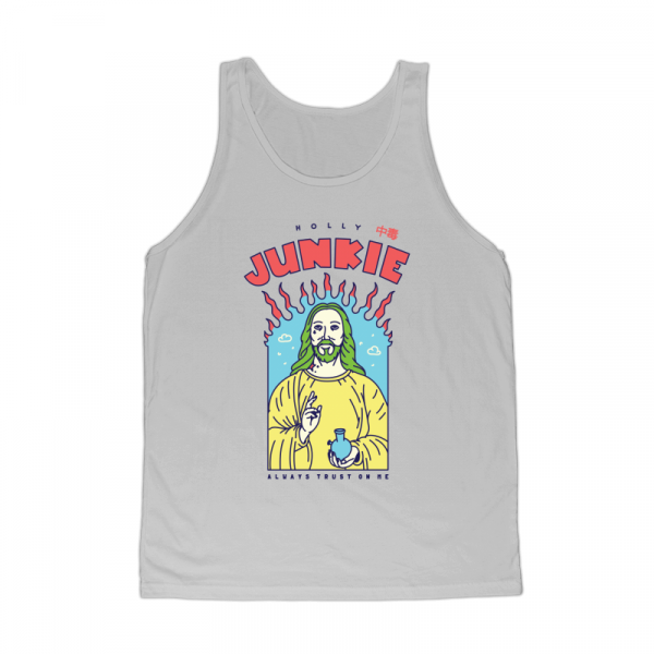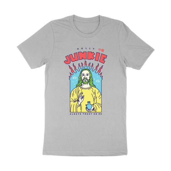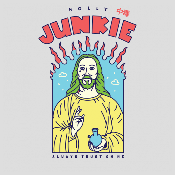 "Holly Junkie" T-shirt design featuring a cartoon style Jesus. The files available are suitable for Adobe Illustrator and Adobe Photoshop and can be used for digital printing and screen-printing.