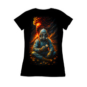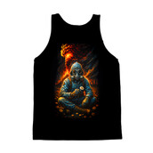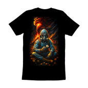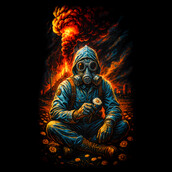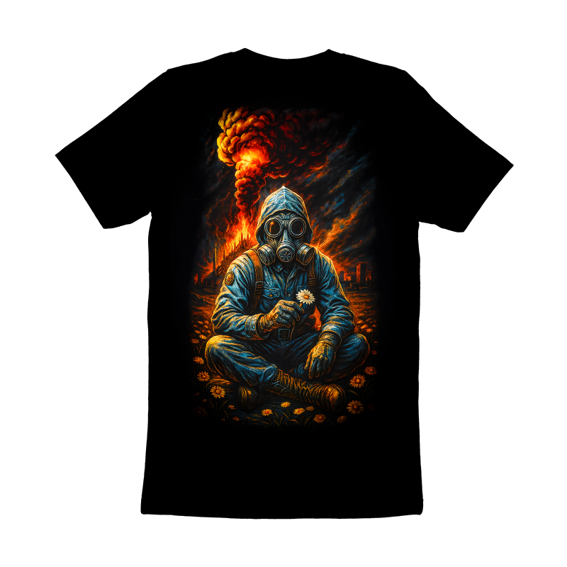 This striking design features a lone figure in a post-apocalyptic landscape, offering a poignant contrast between destruction and hope. The central character, clad in protective gear including a gas mask and heavy boots, sits cross-legged amidst a field of vibrant daisies. The background reveals a city in ruins, engulfed in flames and smoke, emphasizing the devastation. The figure holds a single daisy, symbolizing resilience and the possibility of renewal in the face of overwhelming adversity. The color palette is dominated by fiery oranges and reds in the background, juxtaposed with the cool blues and greens of the figure's attire and the surrounding flora. The overall composition evokes a sense of quiet contemplation and the enduring power of nature. The art style blends realism with painterly effects, creating a visually compelling and emotionally resonant image.