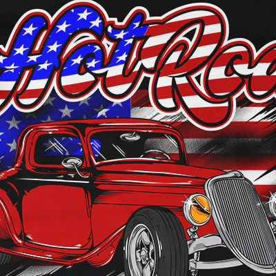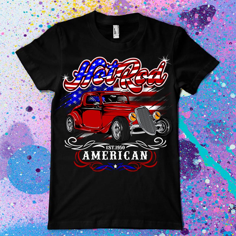 Hot Rod American t-shirt design features a hot rod car design detailed screen print now available for Adobe Illustrator, Adobe Photoshop and can be used for digital printing and screenprinting.