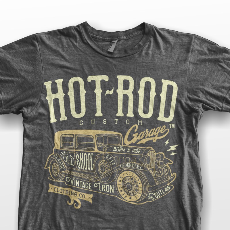 "Hotrod custom " This design use 2 colours on Dark grey t-shirt. it is high quality vector format, easy for editing process, available for Adobe Illustrator, Eps,Pdf and Corel Draw and can be used for digital printing and screenprinting.