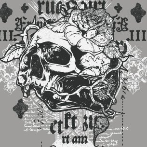 I am heretic graphic design template in vector format, featuring detailed skull with roses instead of hair now available for Adobe Illustrator, Adobe Photoshop and Corel Draw and can be used for digital printing and screenprinting .