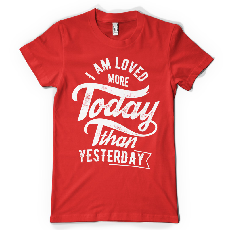 "I am loved more than yesterday" T-shirt design featuring typography style quote, with distressed details. The files available are suitable for Adobe Illustrator, Adobe Photoshop and Corel Draw and can be used for digital printing and screenprinting.
