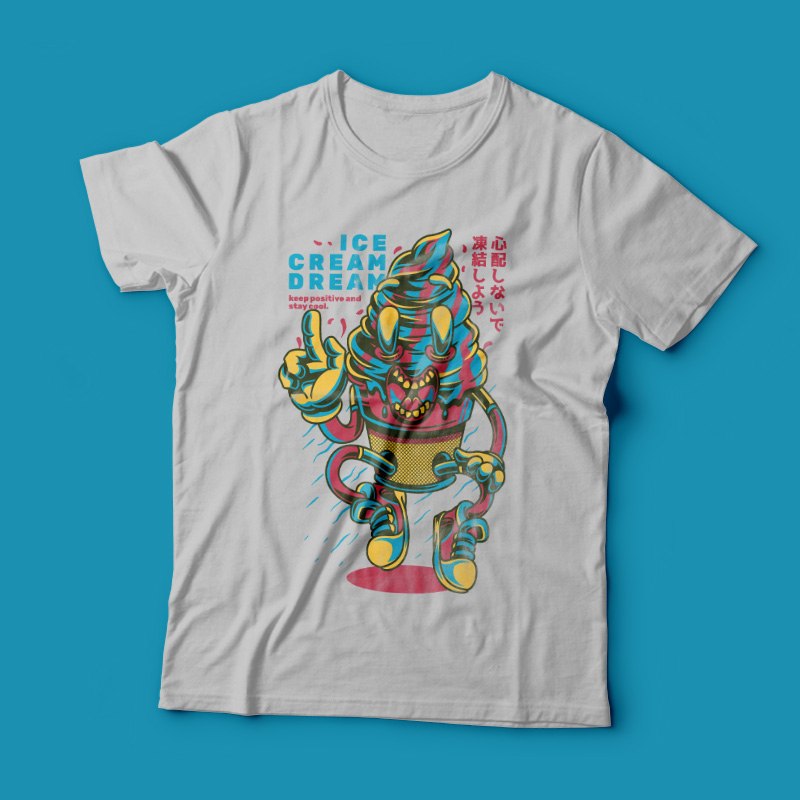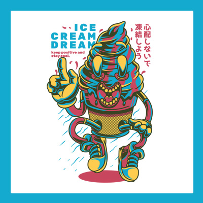 Ice Cream Dream it's a character design that was made in Adobe Illustrator. Based on vector file, easy to resize and edit. File features AI, EPS, and PNG all in zip, CMYK color mode and 4 color. Can be used for digital printing and screen printing.