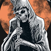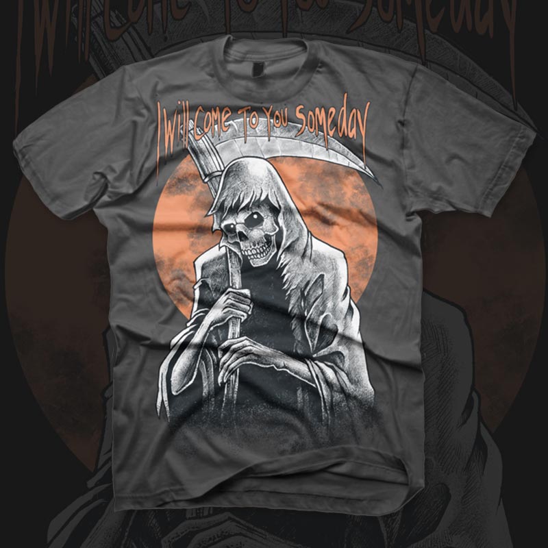 ''i'll come to you someday '' is unique Illustration of a skull grim ripper with some quotes for remembering words. with the dark orange moon for background and use pastel colors pallete...Made with hand painting looking and dark style. Ready to print on t-shirt.