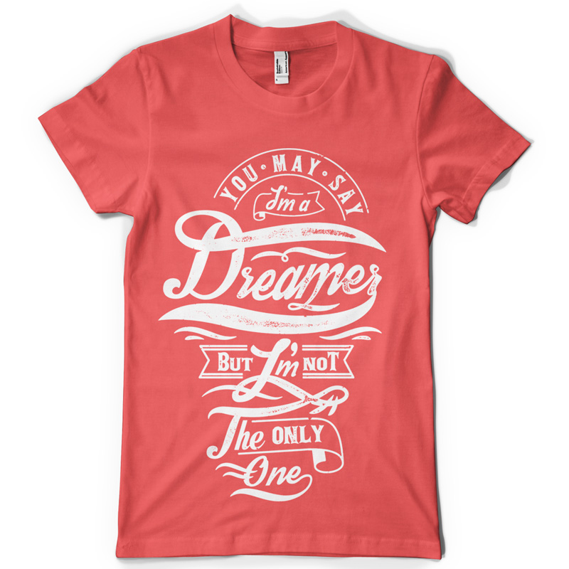 Im a dreamer T-shirt design featuring typography style print with a quote from the famous John Lennon song "Imagine". The files available are suitable for Adobe Illustrator, Adobe Photoshop and Corel Draw and can be used for digital printing and screenprinting.