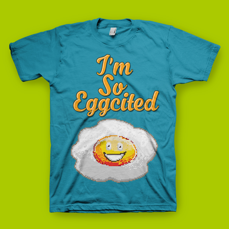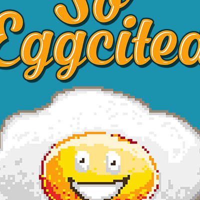 I'm so eggcited food puns character design typography. Inspired from the retro video game pixel art mixed with funny quotes and cartoon illustration. Made with pixel art illustration.
