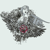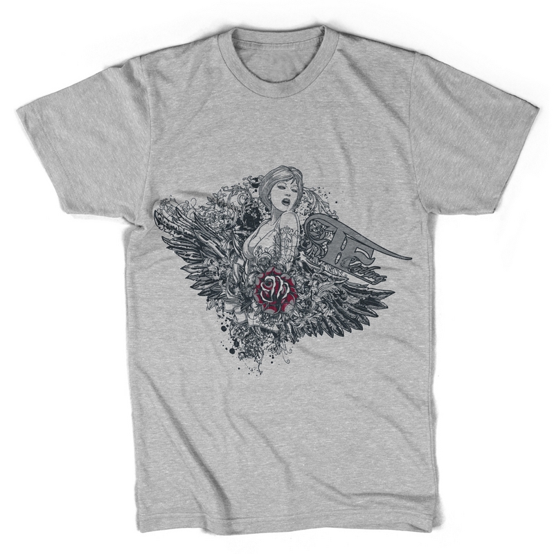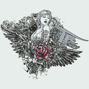 T-shirt template presents sexy girl with flourish details available in vector format for Adobe Illustrator, Adobe Photoshop and Corel Draw and can be used for digital printing and screenprinting .